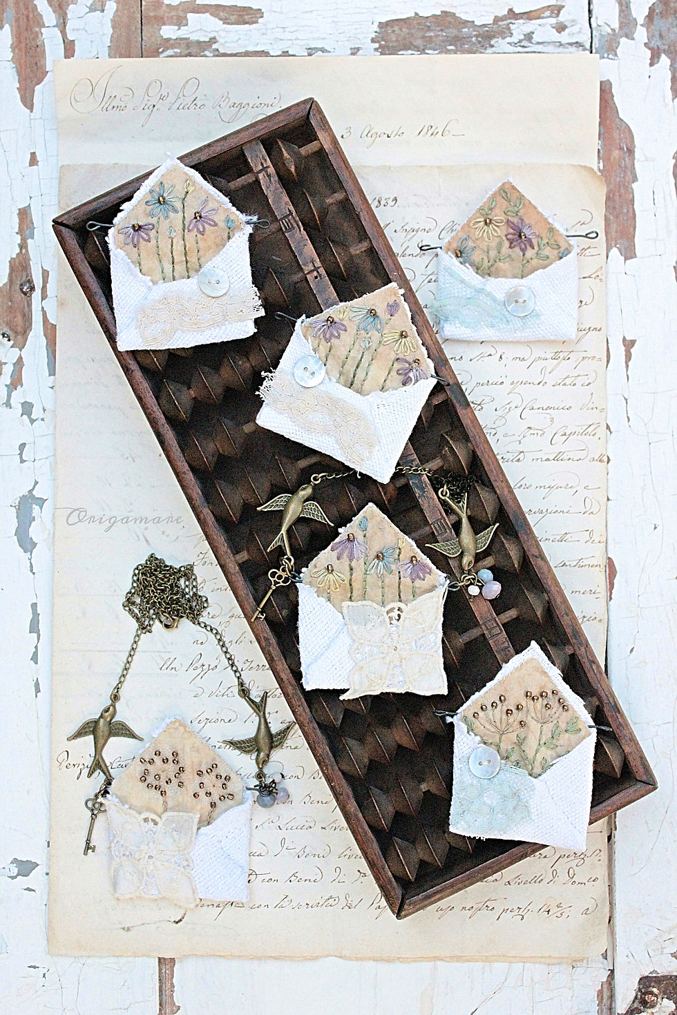 Le collane a busta da lettere di origami in canapa , arricchite poi con trine e bottoni madreperla vintage